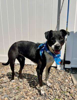 Meet Buck, the energetic and playful 2-year-old pitbull/heeler mix! This charming black and white boy weighs 46 pounds and is bursting with enthusiasm. Living with three other dogs, Buck has developed strong social skills and gets along great with his canine companions.
